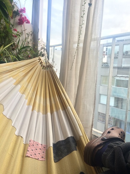Mientras, espero que llegue el sol y caliente mis huesos. En mi terraza soleada de vidrio doble que me separa de los 8º con viento Sur de los confortables 25º del lado de acá Hoy estoy contento después de varios días pensando cómo iba a reparar dos agujeros en mi hamaca que amenazaba con dejarme sin reposo tropical. Y más que no sé coser bien, encotnré la solución… Cola y retal.
